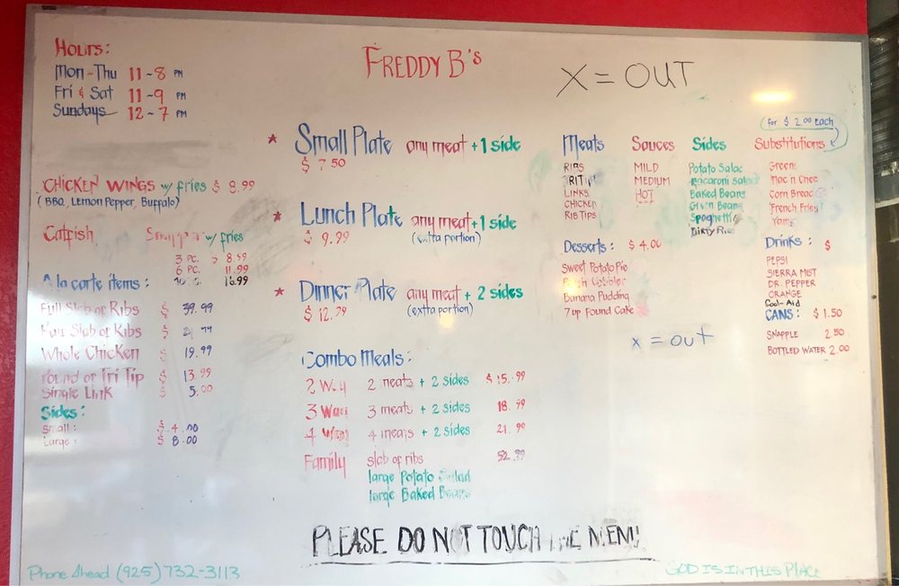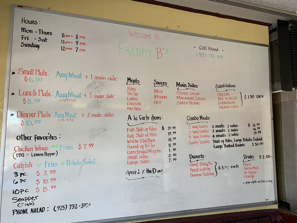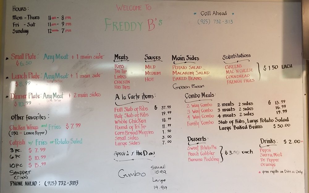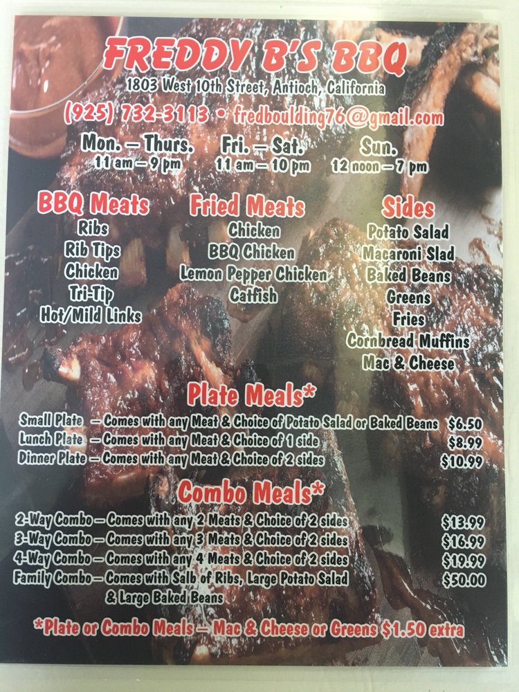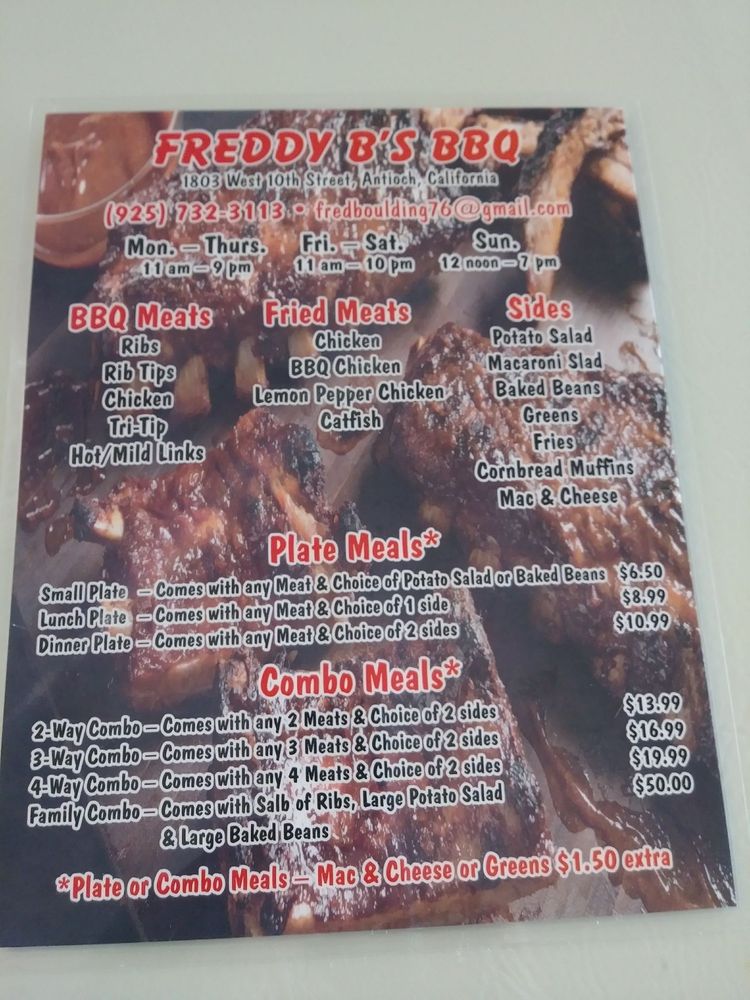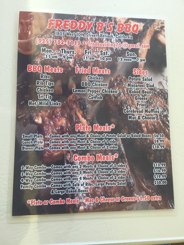 Freddy B’s Bbq in Antioch, CA, offers a variety of mouth-watering barbeque dishes and combo meals. With options like the Family Combo Meal, 4 Way Combo Meal, and A La Carte items such as ribs, tri tip, and sides like potato salad and baked beans, there's something for everyone. Customers rave about the delicious flavors and fast service, with reviews praising the BBQ sauce, brisket, and friendly staff. The casual atmosphere and ample parking make it a great spot for groups and families. Don't miss out on their famous cornbread and fried chicken. Freddy B’s Bbq is a must-visit for BBQ enthusiasts looking for a tasty and satisfying meal experience.